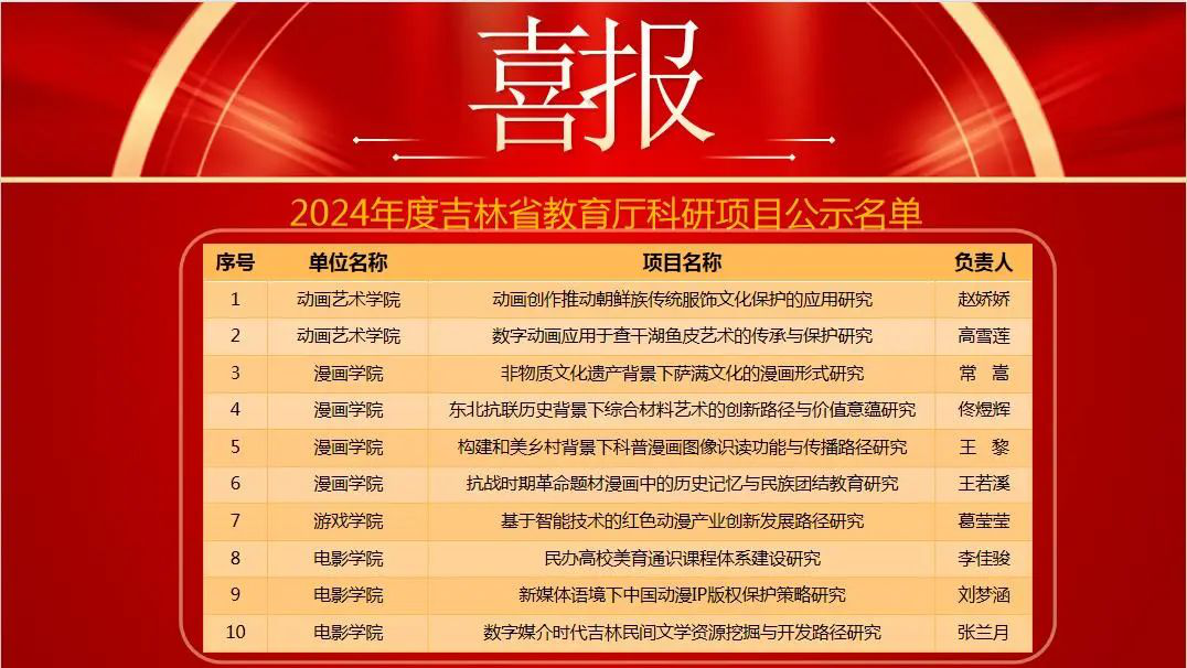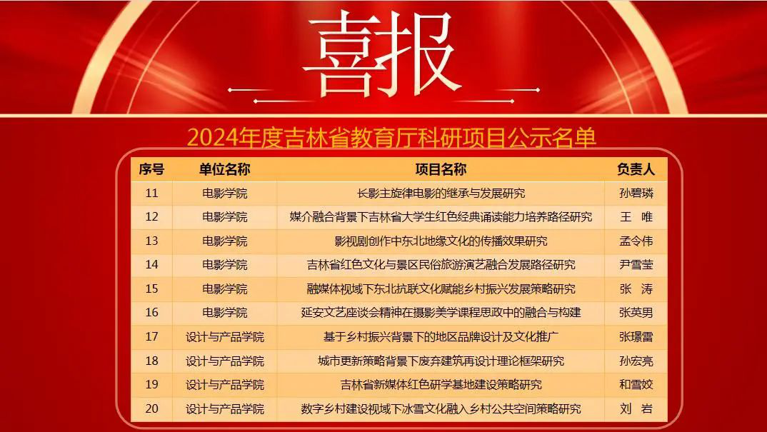 近日,吉林省教育厅、吉林省财政厅下发通知,公布了2024年度吉林省教育厅科学研究项目立项名单,我校获批立项30项,项目涵盖艺术学理论、戏剧与影视、美术与书法、设计学、马克思主义理论、中国语言文学等多个学科。