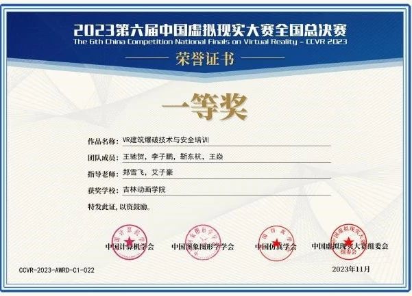 日前,由中国计算机学会、中国图象图形学会、中国仿真学会共同指导举办的第六届中国虚拟现实大赛(CCVR 2023)全国总决赛在江苏苏州落幕。我校虚拟现实与电影技术学院共获国赛一等奖1项,二等奖9项,三等奖6项,beat365唯一官方网站获得省级“优秀组织奖”,再创佳绩。