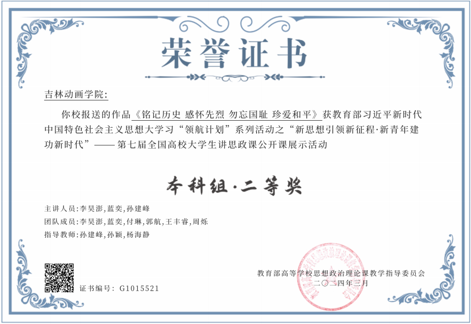 日前,教育部高校思政课教学指导委员会根据《教育部办公厅关于开展习近平新时代中国特色社会主义思想大学习领航计划主题教育活动的通知》(教社科厅函〔2023〕14号)精神,公示了“新思想引领新征程·新青年建功新时代”——第七届全国高校大学生讲思政课公开课展示活动获奖作品结果。我校马克思主义学院思政课教师孙建峰、孙颖、杨海静指导学生李昊澎、蓝奕、付琳、郭航、王丰睿、周烁主讲的《铭记历史、感怀先烈、勿忘国耻、珍爱和平》课程荣获“新思想引领新征程·新青年建功新时代”——第七届全国高校大学生讲思政课展示活动本科组二等奖。