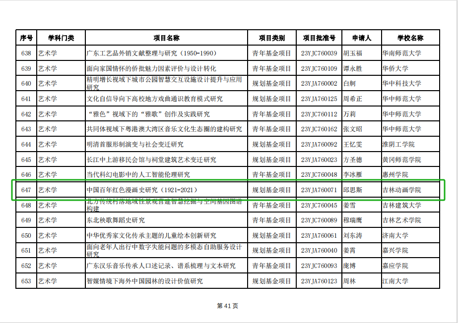 日前,教育部社科司发布了《教育部社科司关于2023年度教育部人文社会科学研究一般项目立项的通知》,我校漫画学院教师邱思斯申报的《中国百年红色漫画史研究(1921-2021》(批准号:23YJA760071)获得立项,获批经费10万元。这是我校继2021年获批教育部人文社会科学研究青年基金项目之后,再一次获得教育部人文社科基金项目,也是我校首个教育部人文社会科学研究规划基金项目。