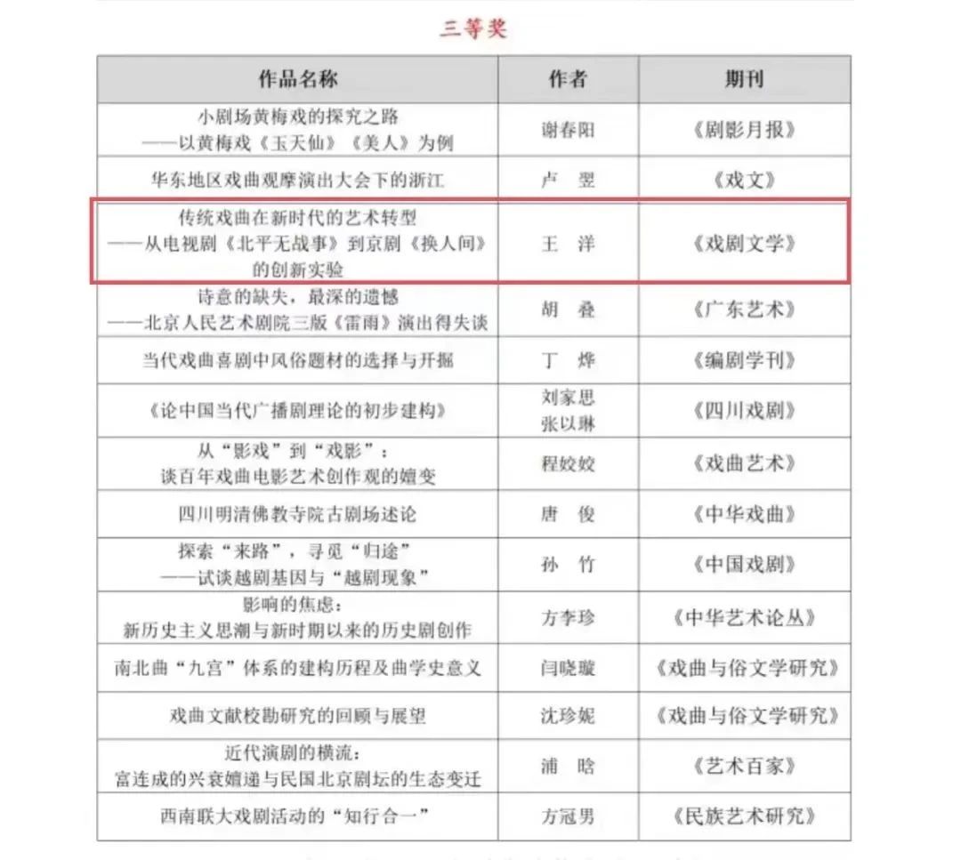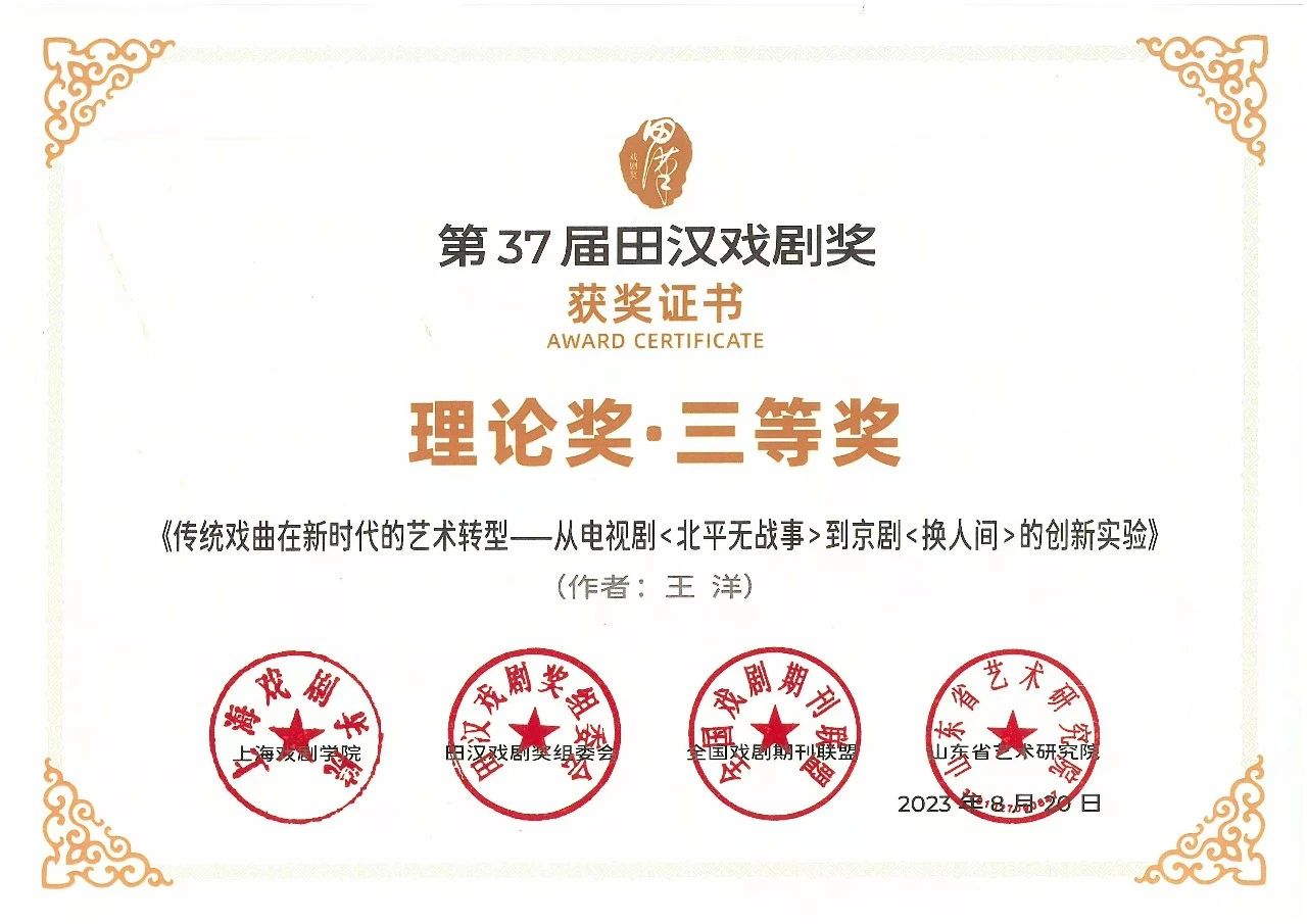 【JAI·荣】学校首次获得田汉戏剧奖 发布时间:2023年09月26日 20:55:00 浏览:次 日前,2023年第三十七届田汉戏剧奖揭晓。我校电影学院教师王洋凭借理论文章《传统戏曲在新时代的艺术转型——从电视剧< 北平无战事>到京剧< 换人间>的创新实验》在本届评选中脱颖而出,喜获理论奖三等奖。这是我校首次获得田汉戏剧奖,实现了历史性突破。 第37届田汉戏剧奖获奖名单(理论奖)