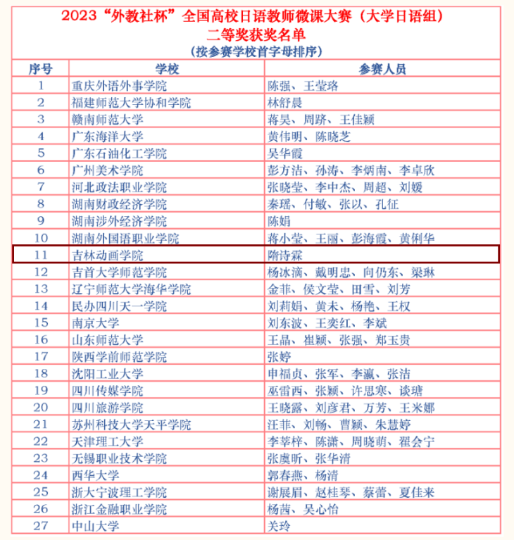 近日,2023“外教社杯”全国高校日语教师微课大赛(大学日语组)圆满结束,我校国交学院日语教师隋诗霖获大赛二等奖,是我校2019年开设大学日语课程以来首次获得全国日语教学比赛类的最好奖项。