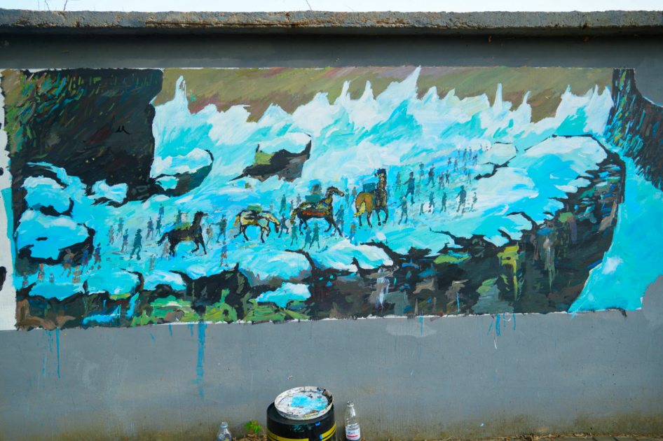 李心茹:4月29日我们一行人来到睿鹏博物馆,下午便开始画稿,经历过一夜风雨后有些墙的稿被冲掉,第二天我们抓紧抢修。让我印象深刻的是大家都努力地去完成这份志愿服务活动,认真地完成绘画、拍摄。