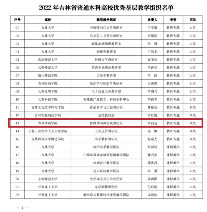 近日,吉林省教育厅公布2022年吉林省普通本科高校优秀基层教学组织名单,经高校推荐、专家评审,我校动画艺术学院新媒体动画实践教研室荣获吉林省普通本科高校优秀基层教学组织称号。