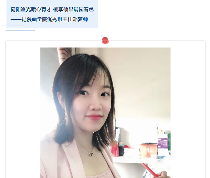 郑梦帅,漫画学院2020级一班班主任,她曾经获得包括“金龙奖”“小白杨奖”“中国学院奖”等28项国内外漫画、动画类奖项,ASIFA-CHINA世界动画协会组织中国部成员,拥有丰富的教育经验与过硬的专业知识。