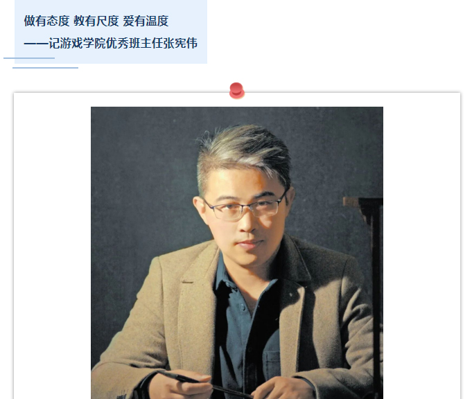 从教十余载,游戏学院优秀班主任张宪伟老师始终坚持“学高为师 身正为范”,以严谨的作风赢得了广大学生的称赞。他在学生教学、班级管理和专业发展坚持严格尺度;在学生生活方面又坚持做有温度的老师,做有尺度有温度的老师。