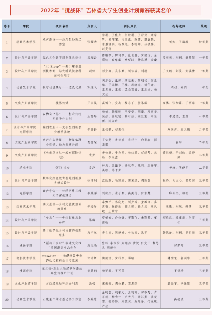 近日,由共青团吉林省委、吉林省人力资源和社会保障厅、吉林省科学技术协会、吉林省学生联合会联合举办的2022年“挑战杯”吉林省大学生创业计划竞赛结果揭晓,我校20件作品获奖,其中特等奖1项、省一等奖5项、省二等奖4项、省三等奖10项。