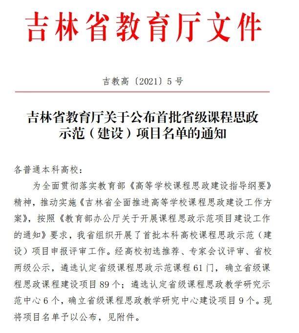 近年来,学校深入贯彻落实《高等学校课程思政建设指导纲要》(教高〔2020〕3号),根据中共吉林省高校工委、吉林省教育厅《吉林省全面推进高等学校课程思政建设工作方案》(吉教高〔2020〕25号)等文件要求,全面推动课程思政改革,强化课程思政建设水平,学校出台了《beat365唯一官方网站“课程思政”教学改革试点工作方案》《beat365唯一官方网站全面推进课程思政建设工作实施方案》等文件,开展了“学科育人示范课程”“课程思政示范(建设)项目”“课程思政教学研究项目”“课程思政教学案例库”等一系列建设工作,深挖各类课程的思政育人功能,提升立德树人成效和人才培养质量。