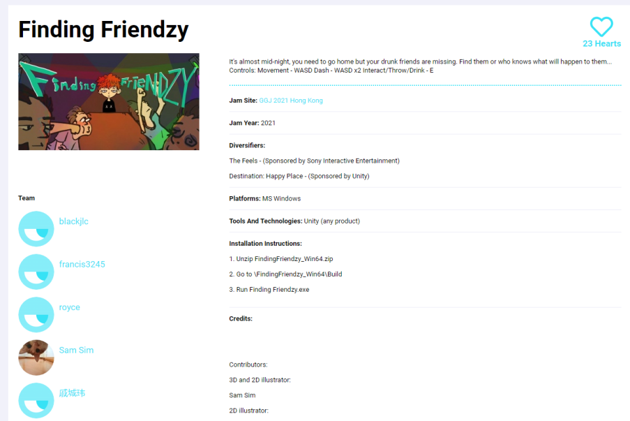 在国际合作发展中心大力协助下,经过前期周密的组织与部署,游戏学院共选派7名学生参加了此次比赛。在本次比赛中,游戏学院2020级数字媒体艺术系学生戚城玮及其所在团队完成的游戏作品“Finding Friendzy”荣获GGJ Online香港分会场最具创新性游戏奖。