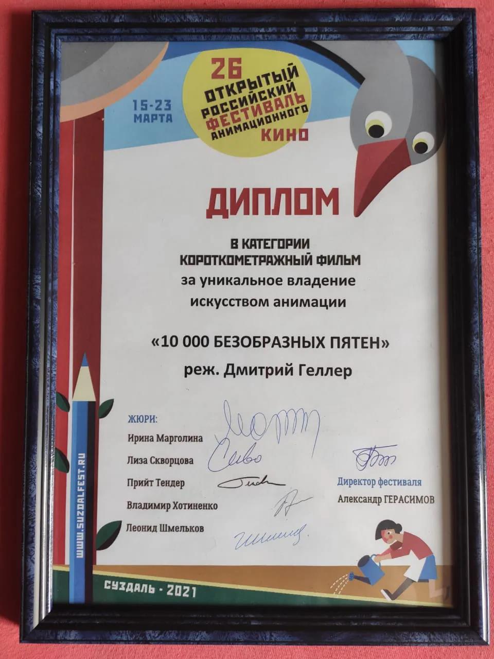 ▲第26届俄罗斯苏兹达尔动画电影节最佳作品奖(白象奖)奖杯及奖状