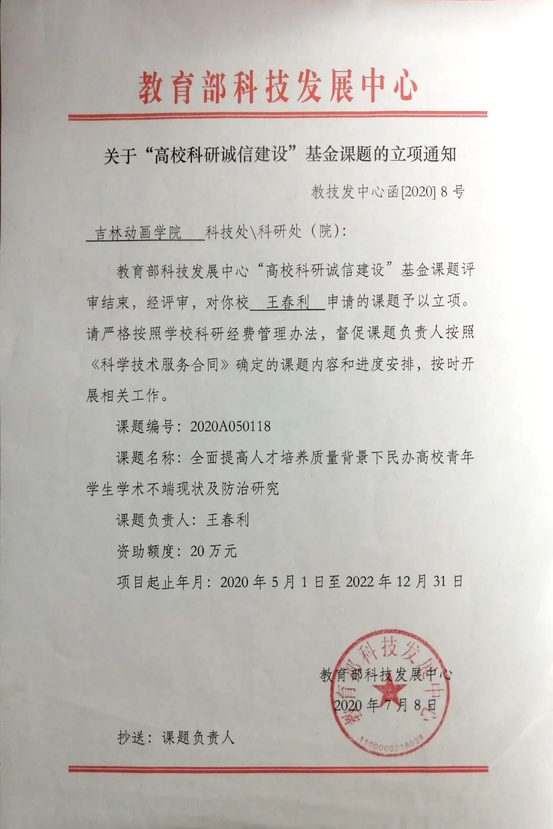 日前,教育部科技发展中心发布关于“高校科研诚信建设”基金课题的立项通知,由我校副校长王春利主持申报的《全面提高人才培养质量背景下民办高校青年学生学术不端现状及防治研究》项目成功立项,获得20万元经费资助。