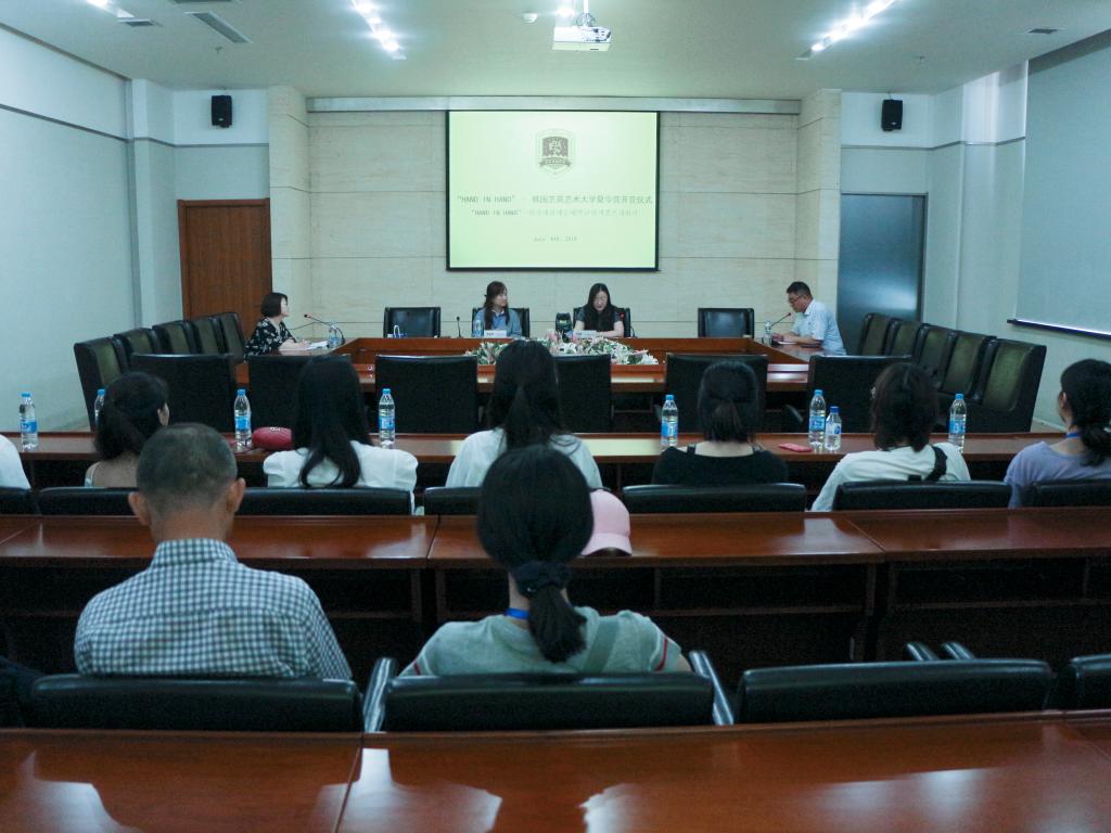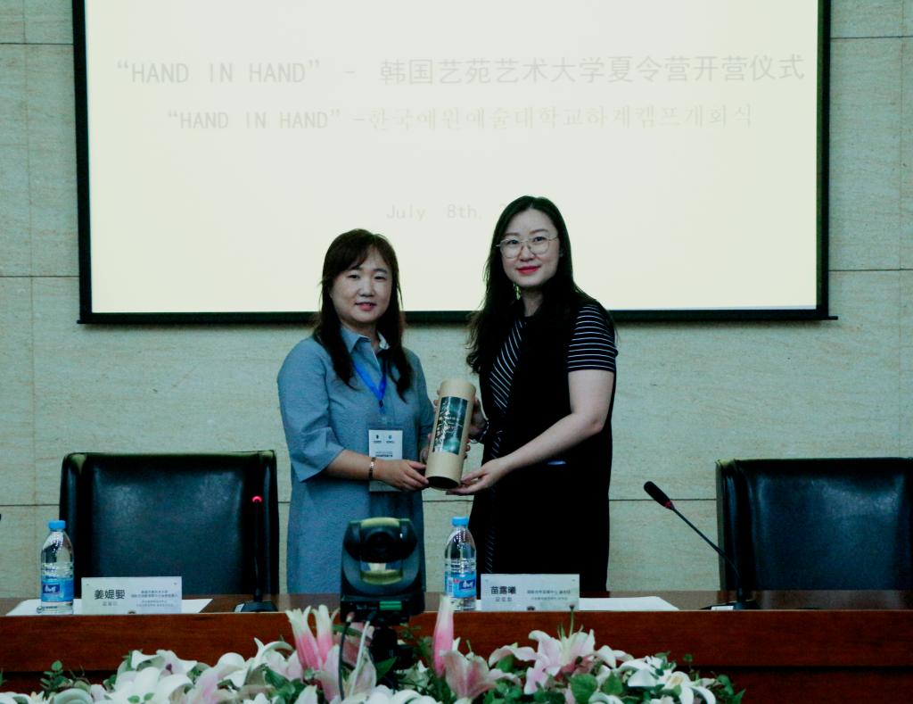 开营仪式上,苗露曦对我校情况作了简单介绍,欢迎韩国学生到我校深入参观交流和学习,苗露曦说,在为期6天的夏令营活动中,来自韩国艺苑艺术大学的同学们将亲身体验中国国画,参加参观我校布朗工作室、德米特里工作室,参观我校校史馆、动漫游博物馆等项目。韩国艺苑艺术大学中日业务负责人姜媞媐作为韩方代表发言,期待两校的合作能持续发展不断深入,并对本次“HAND IN HAND”韩国艺苑艺术大学夏令营充满期待。两校代表互赠礼物、合影留念。