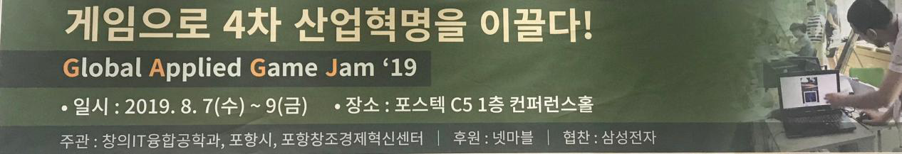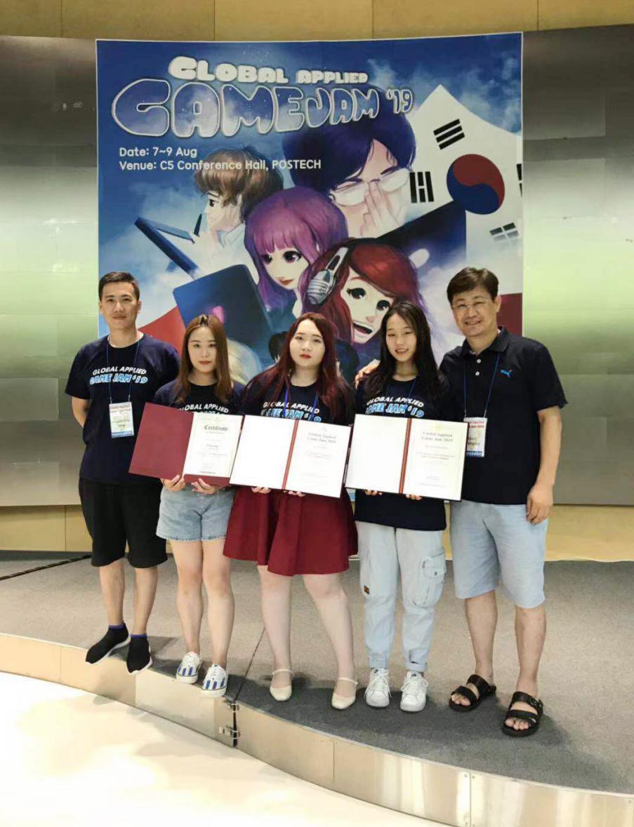 2019年8月7—9日,beat365唯一官方网站游戏学院院长尹炯燮、数字媒体艺术系系主任黄剑锋带领学生付聪、吉无双、翁伊婷,参加在韩国浦项工科大学举办的Global Applied Game Jam 2019游戏制作大赛。我校学生吉无双、付聪同学所在组,获得了本届大赛的优秀奖和最佳创意奖两项大奖。