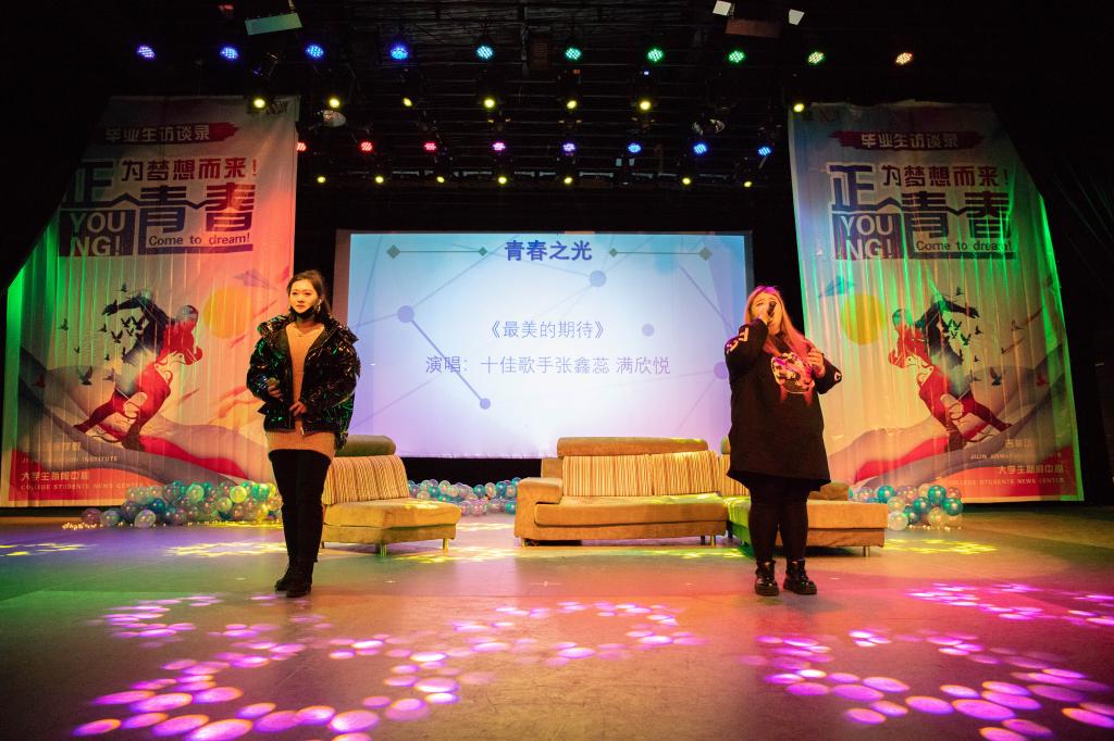 在校园十佳歌手张鑫蕊、满欣悦倾情演唱的歌曲《最美的期待》中,本期毕业生访谈正式拉开了帷幕。