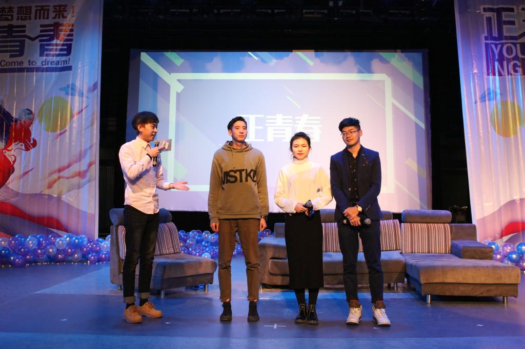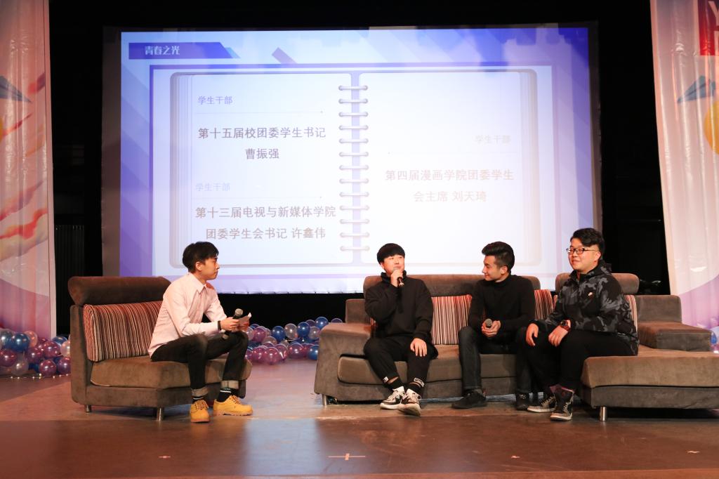 第三组是学生干部代表。他们是游戏学院15级二维游戏美术原创第一工作室、第十五届校团委学生书记曹振强、电视与新媒体学院15级广播电视编导、第十三届电视与新媒体学院团委学生会书记许鑫伟、漫画学院15级欧美漫画项目创作工作室、第四届漫画学院团委学生会主席刘天琦。三位学长热情铿锵,幽默风趣,现场气氛迅速被点燃。他们是学生会干部,亦是普通的大学生,在工作之余与大家无异,而在工作时,他们表示:任何的职务、头衔都是一时的,只有自己是一辈子的,在面对工作时,无论职位大小,都要尽心尽力完成,服务同学,锻炼自我。随后,他们以“吉动学子吉动魂,吉动之魂不忘恩。青春无量,恩情不忘。”寄予了他们对母校最虔诚眷恋。