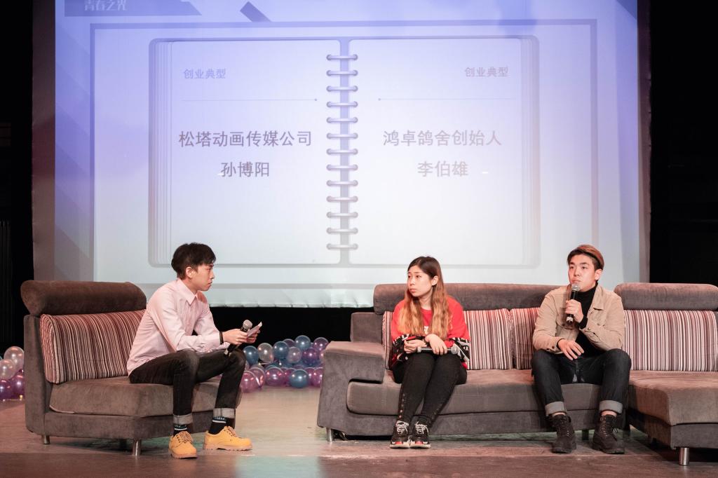 第一组是创业典型代表,两位嘉宾分别是动画艺术学院15级新媒体动画三班的孙搏阳和电影学院15级戏剧影视文学的李伯雄。两位通过自己在创业中的经历告诉大家,勇于抓住机遇是成功的开始。孙搏阳着重提出,在创业过程中公司从无到有主要归功于团队的合作和协调;李伯雄则表示,稳住创业的决心是创业中必要的行为能力。