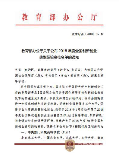 我校获评“2018年度全国创新创业典型经验高校” 发布时间:2018年07月27日 08:32:00 浏览:次 近日,教育部办公厅下发了《关于公布2018年度全国创新创业典型经验高校名单的通知》,我校成功获评“2018年度全国创新创业典型经验高校”荣誉称号。我校也是吉林省唯一一所获此荣誉的高校。