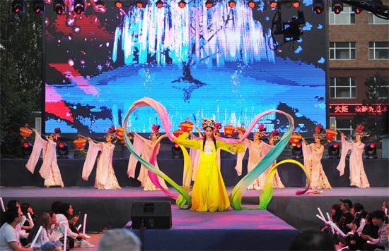 晚会开始前,中央大道早已人头攒动,热闹非凡。在狂热的呼声中,《梨花颂》粉墨开场。22位面容姣好、体态优雅的女子身着玫红色的长裙,脚踩天蓝色鞋子在云雾中翩翩起舞,好似仙女下凡,观众如被引入世外桃源般如痴如醉。