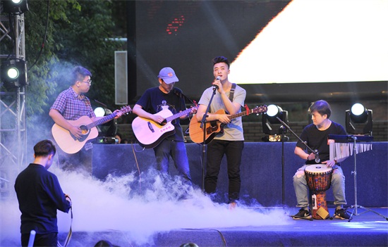 漫画学院的李震老师以及3名多才多艺的男生带来了《歌曲沙画表演——民谣》,他们弹奏着吉他,敲打着架子鼓,配以抓人眼球的沙画表演,清澈干净的歌声在夜空中潺潺流动,一下子把观众带入了静谧的氛围。