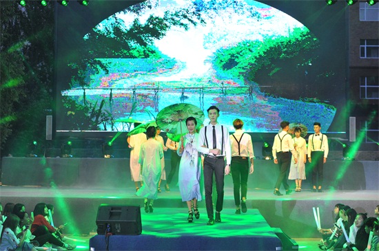 耳边的民谣还未散去,观众的眼福又一次得到了满足。《传统服饰展》的21名帅哥靓女博得了台下阵阵欢呼。该节目以《茉莉花》音乐为背景,男模特们身着绅士装扮,女模特们衣着红花白底长裙、浅蓝长裙、蓝色旗袍交替登场,尽显中国江南古韵文化的美感。