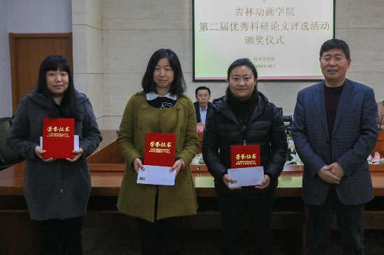党委书记、副校长王清山为获得二等奖的3名教师颁发获奖证书及奖金,这3名教师是:设计学院李季、动画艺术学院李骥、游戏学院姜旬恂。