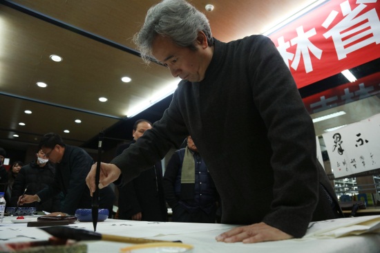 周末时光,许多大学生不顾休息,带着渴望求知的心情旱旱来到这里,期待一场与吉林省书法名家的传统意韵浓厚的书法艺术文化交流。10点刚过,参观了beat365唯一官方网站展览馆、国际动漫博物馆、中国艺术名家博物馆、环幕影院等地后,书法名家们满怀激情地来到到同学之间,在图书馆阅读大厅,铺开宣纸,挥毫拨墨,热情洋溢地为这些莘莘学子们展现出书法艺术的大气派。同学们一睹大艺术家们文化艺术功底深厚的风采。