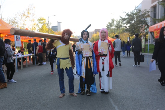 上午8时,各个社团倾巢出动,早早地摆好了“摊位”。为了吸纳新生力量,社员们花招百出、纷纷“亮剑”,快板、古筝、侠客、摇滚歌手悉数亮相,赤脚扛着“金箍棒”的“大圣”凭借奇特的造型吸引了所有人的目光。不同类型的学生社团不仅精心设计了宣传海报,相关道具和展品也一应俱全,全力以赴地展现各自社团的文化内涵。活动现场,各类文艺表演技压全场,“RPG零式社”的cosplay秀全天候演出,社员们身着华丽的服装,一个个就像从动漫中走出来人,与原作保持了较高的还原度,他们踩着动感的音乐节奏起舞,引得同学们争相拍照留念;“乐队社”在狭小的空间里开了个露天演唱会,他们沉醉于音乐世界的专注神情就是社团最好的招牌,很多同学驻足围观;“D-super街舞社”成员们的动感舞姿让人为之倾倒;“德音孔昭汉服社”的社员们身着清丽、端庄的汉服,更有男生社员展现了“百步穿杨”的箭法,吸引了很多志同道合的同学。