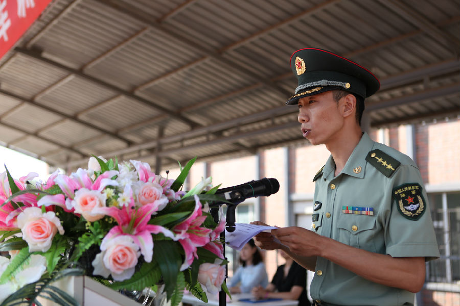 电视与新媒体学院2016级播音主持艺术专业韩抒轩作为新生代表发言。他郑重承诺,将以军人的标准严格要求自己,努力培养吃苦耐劳的意志品质,坚决服从军训营的领导和教官的管理,认真学习教官授予的各项军事技能。