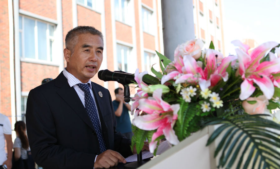 学院党委副书记、校长助理、学工部副部长王晓岩作军训动员讲话(刘华清 摄)