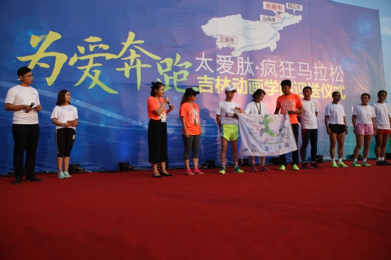 疯狂马拉松组委会的领导还与我校党委书记王清山一起代表组委会和学院向长春市双阳区太平镇土顶中心小学捐赠了3000个“蜗蜗爱心书包”。双阳区教育局基础教育科科长李秀敏及双阳区太平镇土顶中心小学校长赵会臣代表学生接受了捐赠。