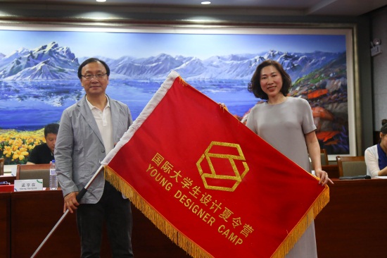 刘欣副董事长、副校长向韩方代表孟亨在教授传递中韩大学生设计夏令营的旗帜(孙建军 摄)