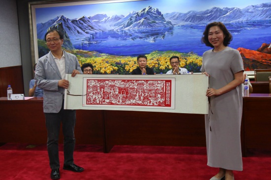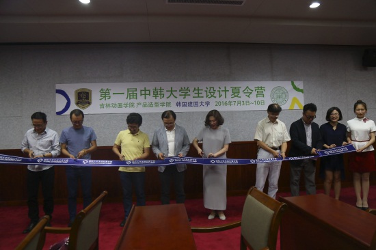 刘欣副董事长、副校长和产品造型学院院长李飞与韩国建国大学孟亨在、吴昌燮教授互赠礼品并合影留念。李飞院长代表产品造型学院向前来参加夏令营活动的韩国学生赠送了纪念品,希望他们能在本次活动中留下美好的记忆。中韩两校嘉宾为夏令营活动剪彩。