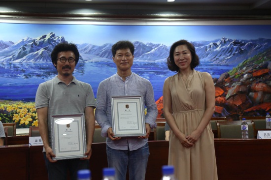 本次比赛共设3类奖项,由我校产品造型学院6名学生和韩国建国大学8名学生分别获得。其中,张明月、KIM HYUNJIN作品《长白山之光》最佳创意奖获奖,朱杰、JUN SOHYUN作品《DAMDA》,胡皓、KIM SUKYOUNG作品《长白四宝》获得最实用奖,另外8名学生获得参与奖。刘欣副董事长、副校长,产品造型学院院长李飞,韩国建国大学孟亨在、吴昌燮教授为本次“长白山旅游产品开发”项目获奖同学颁发了奖杯、奖状和奖金。