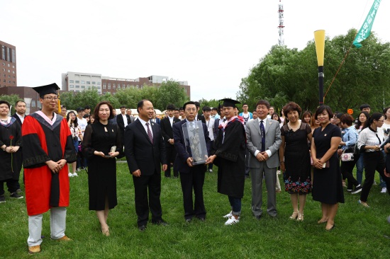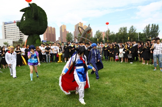 大四毕业生李媛章为母校献礼,送上了70cm高的自由女神像,领导对学生表示感谢并发表了讲话。副校长胡维革对大四毕业生送上祝福:“当你们送上这尊自由女神像的时候,我相信你们的心是向往自由的,在自由之间你们是幸福的,也希望毕业之后的路加油。”在此期间,游戏学院cosplay工作室学生带来了cosplay表演。随后,游戏学院大四毕业生与校领导合影留念。