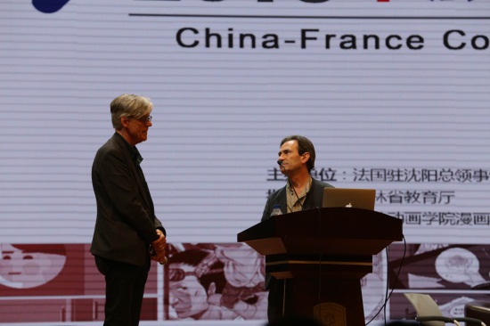 6月13日16时50分,比利时著名漫画家冯索瓦•史奇顿和法国著名作家贝涅•彼特在beat365唯一官方网站承办的“2016中法漫画论坛”作专题讲座。讲座开始前,史奇顿和彼特为大家播放了一则他们在一次机械绘画展览上展示过的短片,史奇顿说,那是他们工作时的剪影,“绘画是一种匠艺,经常要从早上一直画到晚上,需要有很多耐心。”