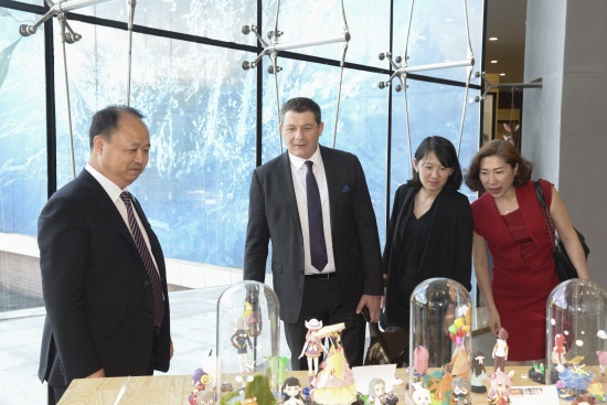 董事长、校长郑立国(左一)和副董事长、副校长刘欣(右一)陪同法国驻沈阳总领事马克•拉米(左二)参观展览(李金元 摄)