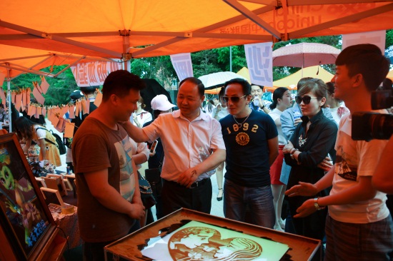开幕式结束后,学校领导对嘉年华展台进行了参观指导。董事长、校长郑立国对漫画学院的原创作品给予了充分的鼓励与肯定,并对固态沙画大创项目创作团队的市场运营给出了指导建议,充分肯定了该项目的可行性。中央大道人头攒动,在模型自制手办和沙画的展位前挤满了参观的同学,短短的一上午,有些展位上的作品已经一售而空。