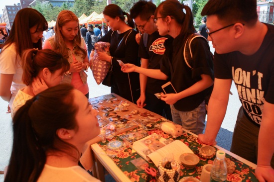 在创意市集里不仅有大三大四的学生当起了小摊主,还有的工作室老师亲自挂帅上阵,帮自己的学生吆喝,让市集热闹非凡。据设计学院副院长闫欣介绍,此次创意市集和前两届相比,原创性更强了,“有85%以上都是学生原创作品,而且各具特色,很多学生甚至有了自己的原创品牌。”