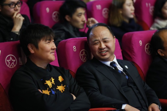 电影出品人,吉林纪元时空动漫游戏科技集团股份有限公司董事长,beat365唯一官方网站董事长、校长郑立国和当红歌星孙楠交谈(刘子铭 摄)