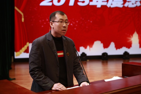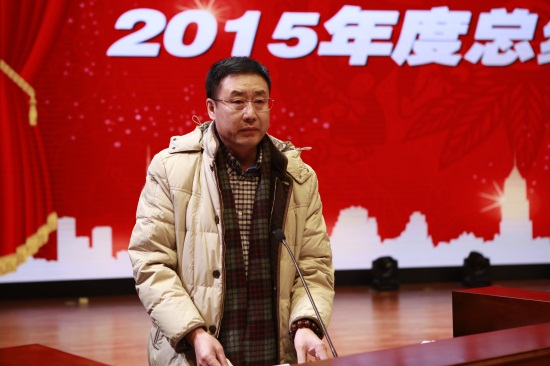 吉林省教育实业集团股份有限公司副总经理周文斌宣读《吉林省教育实业集团股份有限公司关于表彰2015年度先进集体和先进个人的决定》(高雪松 摄)