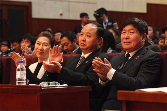 董事长、校长郑立国(中),党委书记、副校长王清山(右),副董事长、副校长刘欣(左)等学校领导出席大会(刘子铭 摄)