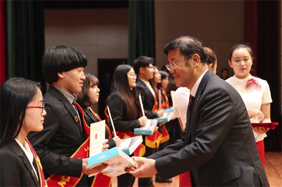 副董事长、副校长刘欣宣读对国家奖学金、国家励志奖学金、学校奖学金、校长奖学金和董事长创业奖学金的表彰决定(刘子铭 摄)