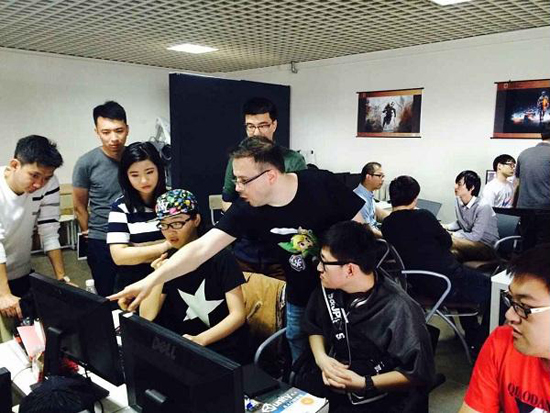 在欣赏工作室中学生们优秀作品时,依欧阿尼斯·莫塔佛格罗极为惊讶,对我校学生在校期间就有很好的成绩,表示赞许。他还对学生的作品一一评点,使学生们在原有的基础上,完善了游戏的画面风格和色彩的冷暖关系,加强了场景渲染的气氛,突出了人物的性格,提升了作品的艺术水平,使学生们表示获益匪浅,极为高兴。