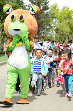 青蛙王国的蛙神欢迎小朋友来学校过“六一” 陈云鹏摄