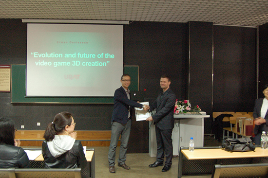 游戏学院美术基础教研室主任袁小东老师,代表我校为艾赫文·戴维斯颁发客座教授证书,希望日后艾赫文·戴维斯能够为我校师生提供更多的精彩讲座,两校能有更多的合作机会。