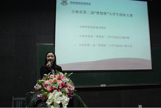 吉林省创促会的赵倩主任介绍了创促会及本次大赛的相关内容,她全面地为我们讲解了大赛的目标,上届大赛取得的成果以及本届大赛的亮点。随后我校的优秀创业学生代表冯志瑞和张福圣也向大家分享了他们的创业故事。