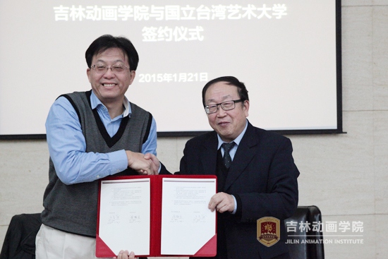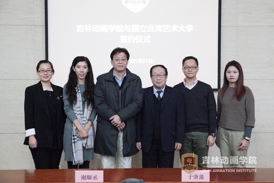 参观结束后,学院院长于庚蒲、副主任鲍怡萍与嘉宾们进行了合作洽谈。谢颙丞校长介绍了台湾艺术大学和现有的合作交流模式。一是学生交流,可进行的有一学期的交换生、冬夏令营、学分专班、3+1合作办学。二是教师交流,包括长短期讲学、进修。三是共建实验基地,联合展演,共同举办作品竞赛。谢颙丞校长赞赏了我院学产对接实践教学平台,说道:“贵校产学合作做的非常好!我校也有动漫、设计、传媒、影视戏剧、文创等,和贵校专业设置有着80%的契合度,我们可以从多方面深化合作。”于庚蒲院长对谢颙丞校长的合作想法给予赞同,并表示学院每年会举办国际论坛,欢迎台湾艺术大学的老师们参加。最后,于庚蒲院长和谢颙丞校长分别代表两校在学术交流协议书上签字,两校正式缔结姊妹院校。学生交流方面,每学期可选派1至3名学生赴台湾艺术大学交换学习。预计今年3月份就可启动交换生选拔工作,9月份将有第一批交换生赴台湾艺术大学交流学习。