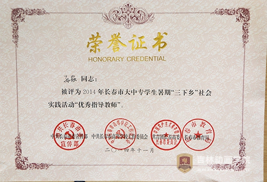 此次表彰我院获得2014年度吉林省大中专学生志愿者暑期“三下乡”社会实践活动暨“百基千队服务万村行动”优秀组织工作奖;动漫分院社会实践小分队、设计分院社会实践小分队分别获得2014年度吉林省大中专学生志愿者暑期“三下乡”社会实践活动暨“百基千队服务万村行动”优秀团队和2014年度吉林省“百基千队服务万村行动”先进团队。刘宝雨、刘博获得2014年度吉林省大中专学生志愿者暑期“三下乡”社会实践活动暨“百基千队服务万村行动”先进个人。学院团委获得2014年长春市大中专学生暑期“三下乡”社会实践活动优秀组织单位和校地对接工作优秀组织单位。设计分院、游戏与数字媒体技术分院、传媒分院社会、影视戏剧分院、广告分院、文化产业管理分院组织的社会实践小分队获得了2014年度长春市大中专学生暑期“三下乡”社会实践活动优秀团队。孙强、孙健获得2014年长春市大中专学生暑期“三下乡”社会实践活动优秀指导教师奖;周毅、王春龙、闫卫东、李昊然、闻佐宬5名学生获得了2014长春市大中专学生暑期“三下乡”社会实践活动先进个人奖。李萌田、任宪亮、张金铭、宋英男、李佳芮、杨茉6名学生获得了2014年长春市大中专学生暑期“三下乡”社会实践活动优秀随笔。