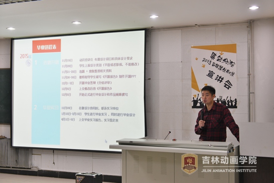 广告分院院长助理安春城老师就毕业前毕业设计、毕业论文环节与学生交流。他对分院毕业环节的安排进行详细讲解,他提到了毕业设计、论文环节的时间结点,并交流了毕业设计选题的相关工作。