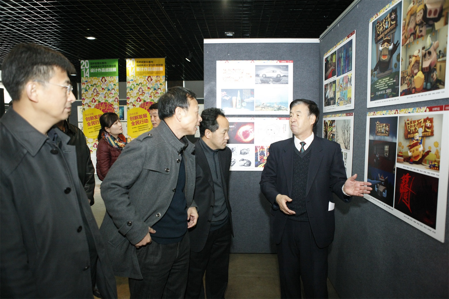 学院党委副书记、副院长王英教授做了情况介绍,他说:本届“巡回展”概括起来有以下特点,一是坚持社会化道路,活动的覆盖面和影响力与日俱增。在活动筹备阶段,我们与主办单位积极配合,通过新闻媒体向社会广泛征集优秀作品,不但设计专业类学生可以参加,其他非设计专业的学生,同样可以投稿参与,提升了活动广泛性和参与度,本届参展院校达到28家,参展数量达到了1021件,入选作品745件。二是围绕科普日主题,艺术与科普创新融合的探索更加深入。今年的参展作品种类丰富,在原有招贴设计、环境设计、产品设计为主的基础上,动画类、漫画类、游戏类、微电影等多个领域的一批优秀作品涌现出来。同时,科普日“创新发展、全民行动”主题的开放性,也为同学们提供巨大的创意空间,并展现他们的作品中。三是倡导多赢理念,高校科普创作联合与协作的局面初步形成。以设计分院徐欣院长为首的设计分院团队,充分发挥网络优势,通过课程导入、兴趣交流等多种有效手段,激发同学们的创意思维,将科普创意设计“植入”各协作单位教学当中,为活动积蓄了创意活力,同时也搭建了一个鼓励师生创新的重要平台;抓住机遇,主动工作,在开展校际合作过程中,展示科普创意魅力,吸引各高校加盟。尤其在台湾方面,合作院校已达8所,参展作品达到144件,为拓展对台交流渠道开辟了新的空间。本次校内展览结束后,我们将本着“联合、协作、共享”的原则,在省内部分协作校院开展为期一个月的巡回展示活动。